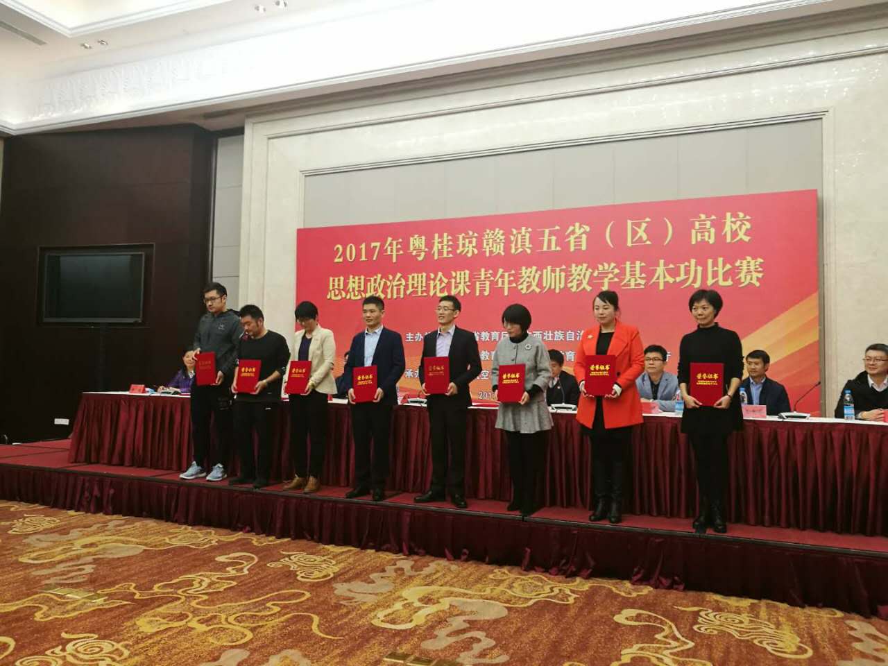 11月29日至12月1日,由广东省教育厅、广西壮族自治区教育厅、海南省教育厅、云南省教育厅、江西省教育厅主办,南昌航空大学承办的2017年粤桂琼赣滇五省(区)高校思想政治理论课青年教师教学基本功比赛,在江西省南昌市举行。此次比赛选手分别为来自五省(区)高校思想政治理论课的优秀青年教师,共计20名。公司beat365亚洲体育官方网站徐满泽老师作为广东省选手之一参与本次比赛,并荣获二等奖。该公司党总支书记翁礼成教授、副经理秦抗抗等老师前往观摩比赛。