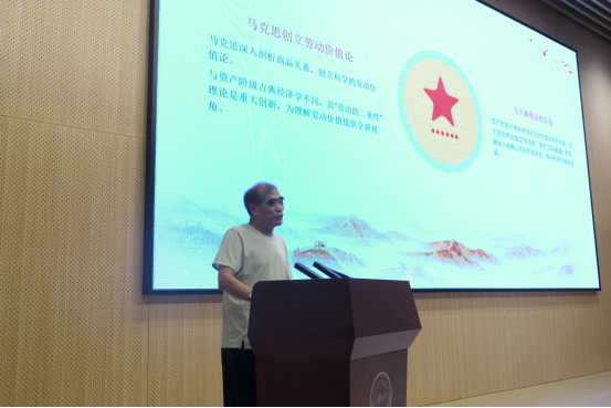李焕青以“劳动价值与奋进力量”为主题,从马克思创立劳动价值论、与古典理论的区别、具体劳动与抽象劳动、必要劳动与剩余劳动等方面解读了科学的劳动价值论,以及对社会主义市场经济的意义。