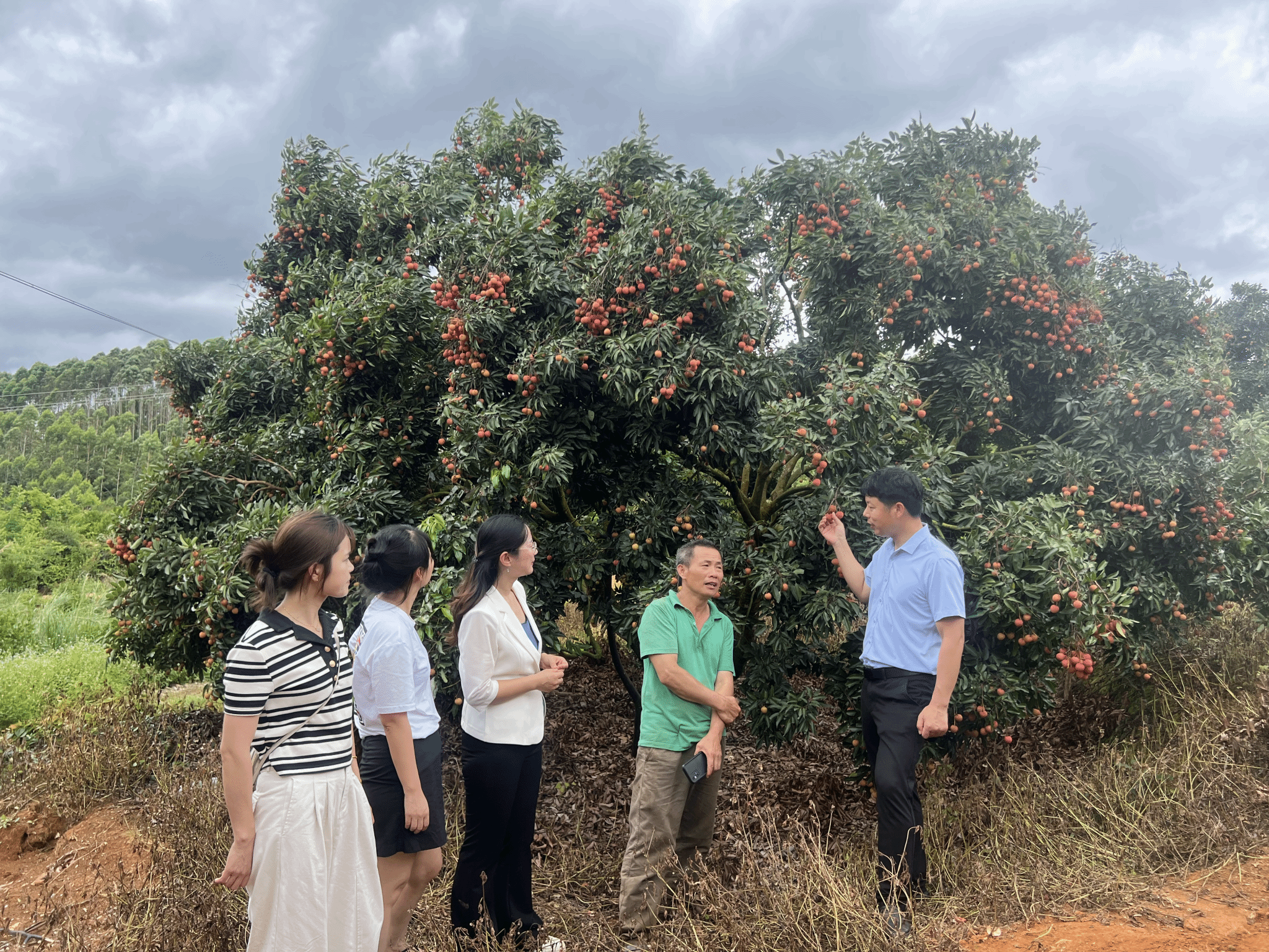为应对台风“蝴蝶”登陆,保障荔枝稳产增收,6月12日至14日,由beat365亚洲体育官方网站驻高州市石板镇科技特派员团队负责人周映萍及成员魏晓、特邀水肥一体化技术专家涂攀峰及广东省林业科学研究院易君文博士组成的科技服务团队,深入高州市石板镇开展荔枝种植管理及采后保鲜技术指导。石板镇党委副书记彭浪,党委副书记(挂职)、驻镇工作队队长练海,党委委员陈建丽等领导同志共同参与了调研。