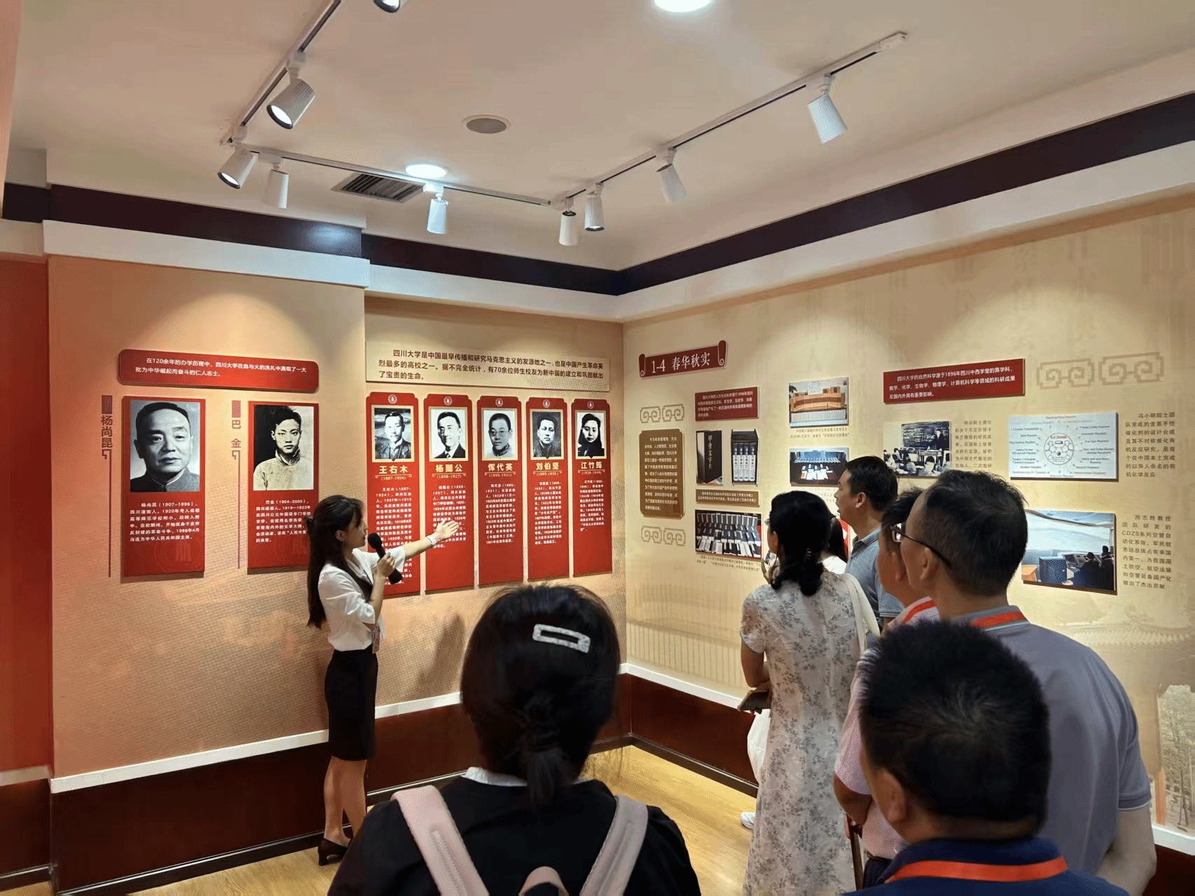 四川大公司史展览馆拥有丰富的校史实物资料和珍品档案,全面反映了四川大学120余年的发展历史,讲述了朱德、郭沫若等著名员工的人物故事,展现了川大人“救国兴国”的光辉奋斗史,体现了中国高等教育事业与中华民族伟大复兴的同频共振。在研修过程中,学员们认真聆听讲解员老师的讲解,仔细观看展览资料,感受“教育强国”的重要意义和时代重托。