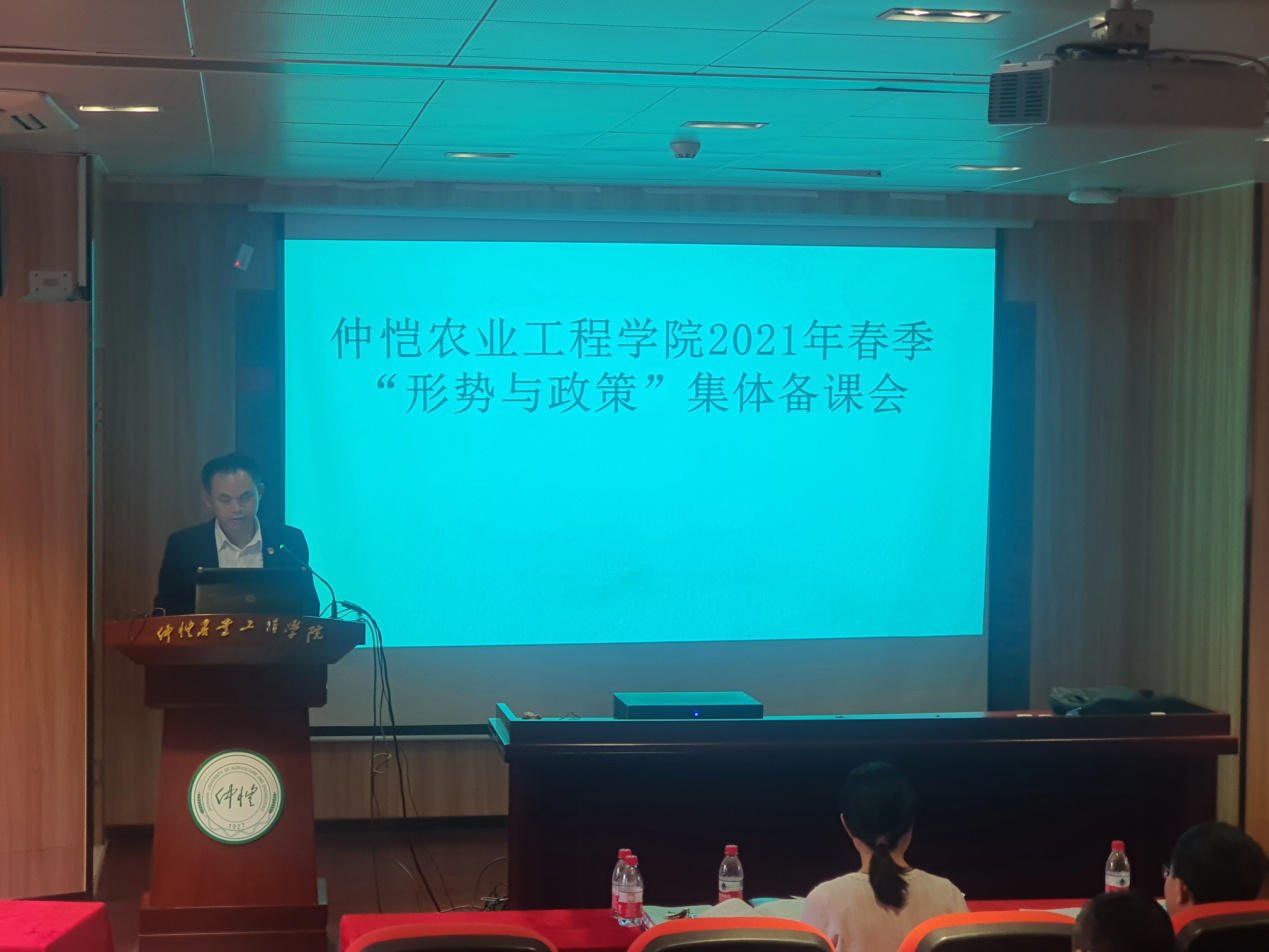 为深入学习贯彻习近平新时代中国特色社会主义思想和2021年全国“两会精神”,提升“形势与政策”课质量和水平,根据《广东省教育厅办公室关于2021春季“形势与政策”课备课会的通知》、《广东省教育厅关于做好2021春季学期高公司党委书记、董事长和院(系)党组织书记、经理(系主任)及中小学党组织书记、董事长上第一堂思政课工作的通知》、《关于做好各公司党总支书记、经理上第一堂思想政治理论课工作的通知》(仲党办字[2021]8号)以及公司的相关制度,beat365亚洲体育官方网站于4月9日在英东楼111学术报告厅举办了2021春季学期全校“形势与政策”课集体备课会。会议由蔡立彬经理主持,秦抗抗副经理介绍本学期“形势与政策”课教学安排,形势与政策教研室施张兵、向丽和李晓燕等三位专任教师做示范教学。