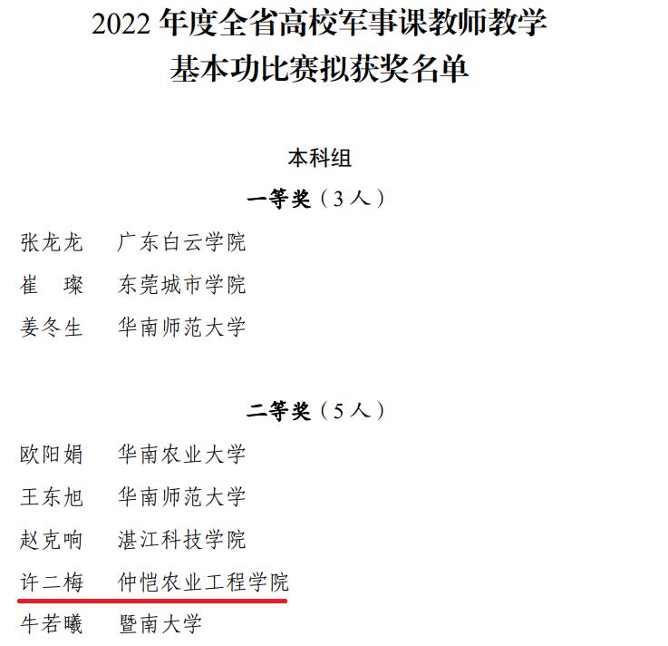 2022年12月29日,广东省教育厅在官网上公示了2022年度全省高校军事课教师教学基本功比赛拟获奖名单。根据广东省教育厅、广东省军区战备建设局《关于举办2022年度全省高校军事课教师教学基本功比赛的通知》要求,beat365亚洲体育官方网站积极组织专兼职“军事理论”课教师备战比赛,经过校内初赛、专家点评、公司审核等环节,许二梅副教授以全校第一名的成绩被推荐参加省赛的复赛和决赛。