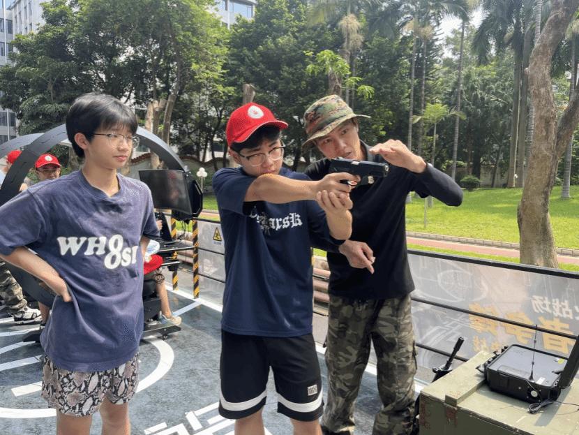 “三点一线、稳住手、调整呼吸、瞄准靶心、扣下扳机。”在模拟射击区,同学们体验95式自动步枪激光打靶,感受操作武器装备的荣誉感、神圣感。
