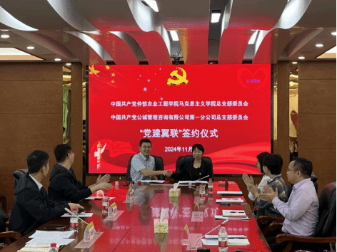 11月8日上午,beat365亚洲体育官方网站党总支与公诚管理咨询有限公司第一分公司党总支在公司海珠校区开展“党建翼联”共建签约活动。公诚管理咨询有限公司第一分公司副总经理、党总支纪检、委员团委书记李元元,公诚管理咨询有限公司第一分公司总经理助理、第一支部书记关志勇,beat365亚洲体育官方网站党总支书记姜晓丽,beat365亚洲体育官方网站党总支委员、副经理秦抗抗、李增添,以及双方党员代表24人共同参加本次共建活动。