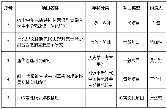 近日,广东省哲学社会科学规划2025年度项目立项名单发布,beat365亚洲体育官方网站刘慧、杨丽萍、吴宇翔、王伞伞、张达玮五位老师负责的5项课题获得资助,其中一般项目3项,青年项目1项,岭南文化项目1项。立项课题专业领域涉及马列·科社、历史学(考古学)和习近平新时代中国特色社会主义思想研究等。